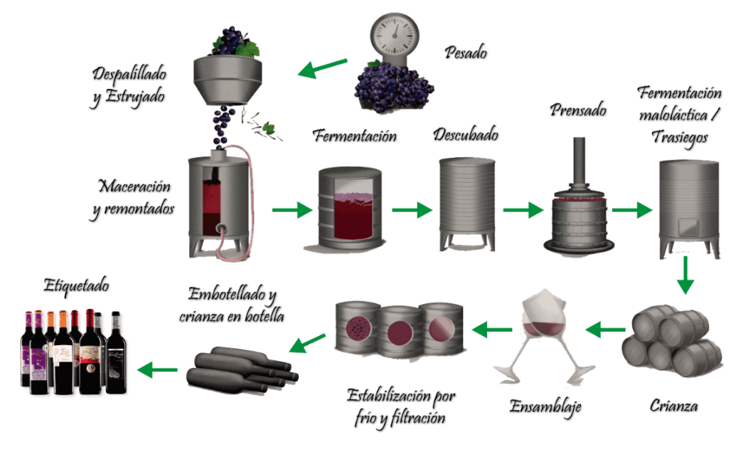 Todo comienza con la vendimia, donde se seleccionan las mejores uvas. Luego, se realiza el estrujado y despalillado, seguido de la fermentación, donde el azúcar se convierte en alcohol.